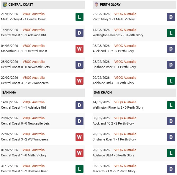 - Trên sân nhà, Central Coast thắng 2, thua 4 trước Perth Glory.