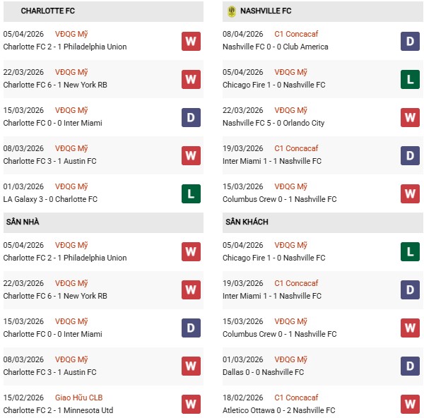 Cách đây vài ngày, Nashville đã không làm sao đánh bại được các vị khách Club America (Mexico) tại lượt đi tứ kết Concacaf Champions Cup 2026 để chiếm chút lợi thế trước trận lượt về vào giữa tuần sau. Với kết quả như vậy thì Nashville nhiều khả năng càng bị phân tâm trước chuyến làm khách của Charlotte.