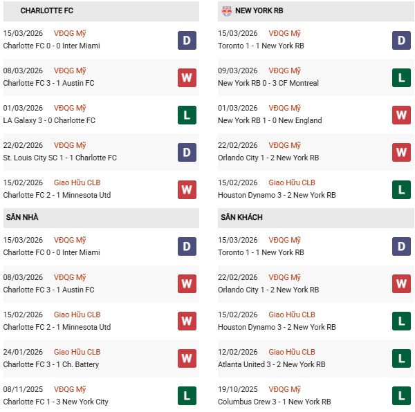 - Trên sân nhà, Charlotte thắng 2, hòa 2 trước New York RB.