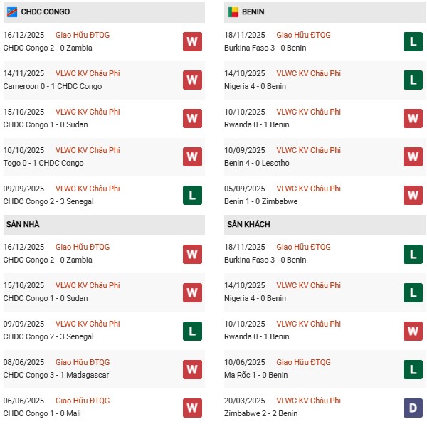 - CHDC Congo thắng 1, hòa 1 trong 2 trận đối đầu Benin gần đây.