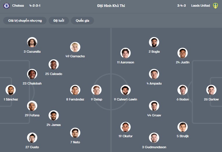 Chelsea bước vào trận đấu với Leeds với sự tự tin khi họ đang dần định hình lối chơi của mình. Được thi đấu trên sân nhà, “The Blues” thường chủ động kiểm soát bóng, triển khai tấn công từ tuyến giữa với nhịp độ cao. Hàng công của Chelsea tuy chưa thực sự bùng nổ nhưng có chiều sâu, sẵn sàng gây sức ép liên tục nhờ khả năng dâng cao của hai biên.