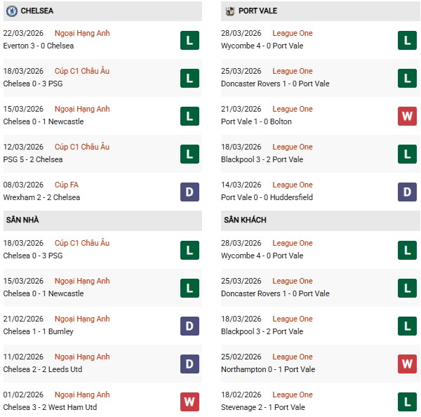 Trong khi đó, Port Vale lại thể hiện phong độ kém thuyết phục khi chỉ thắng 1/5 trận gần nhất. Họ ghi 4 bàn nhưng thủng lưới tới 10 lần, trung bình 2 bàn thua mỗi trận. Khi thi đấu sân khách, Port Vale thường gặp khó trước các đội mạnh hơn. Điều này khiến họ bị đánh giá rất thấp ở cả kèo châu Á lẫn 1×2.