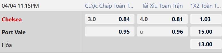 Kèo 1×2: Tỷ lệ 1×2 cho Chelsea thắng rất thấp, đang ở mức 1.03, cho thấy khả năng thắng gần như chắc chắn. Port Vale khó có cơ hội tạo bất ngờ khi phong độ kém và chênh lệch đẳng cấp lớn. Đây là kèo dễ chọn nhất.