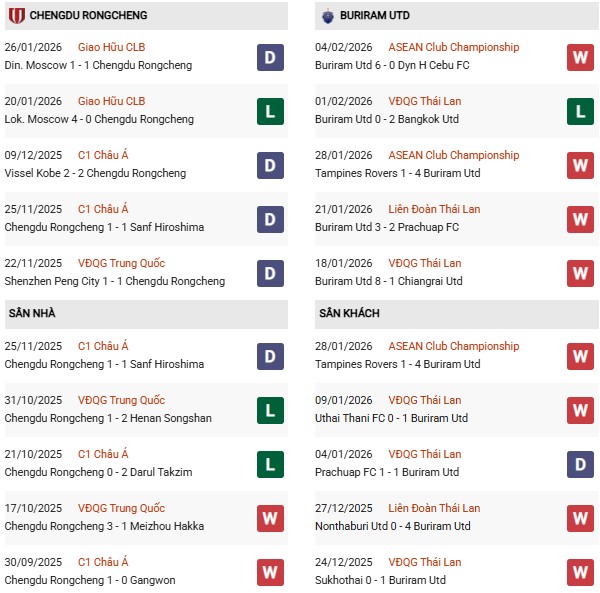 Thống kê phong độ Chengdu Rongcheng vs Buriram: