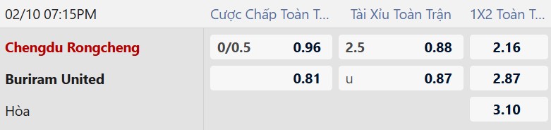 Thông tin tỷ lệ bóng đá Chengdu Rongcheng vs Buriram: