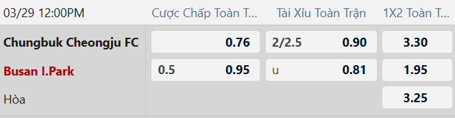 Thông tin tỷ lệ Cheongju vs Busan I Park: