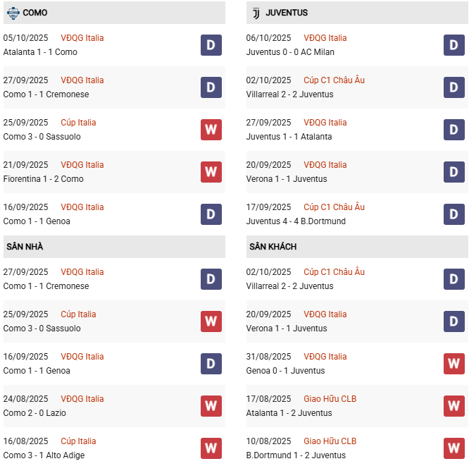 Thống kê phong độ Como vs Juventus: