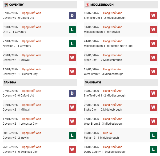 - Coventry toàn thắng cả 5 trận đối đầu vừa qua trước Middlesbrough.