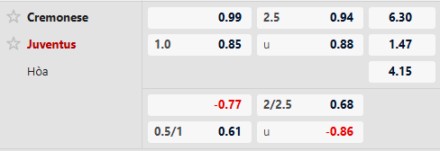 Thông tin tỷ lệ kèo Cremonese gặp Juventus: