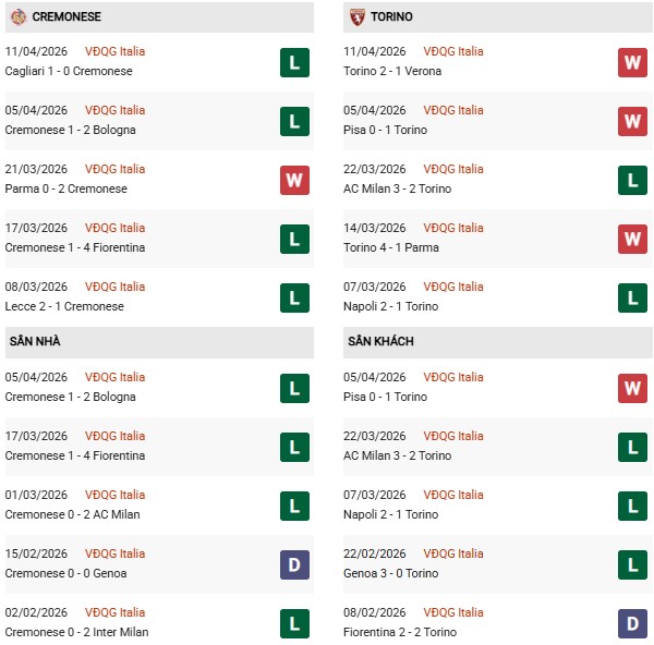 - Trên sân nhà, Cremonese thua cả 3 trận trước Torino.