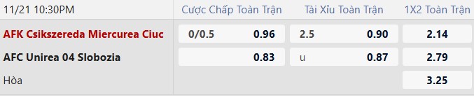 Thông tin tỷ lệ cược Csikszereda vs Unirea Slobozia: