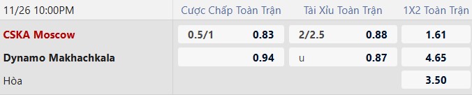 Thông tin tỷ lệ CSKA Moscow vs Makhachkala: