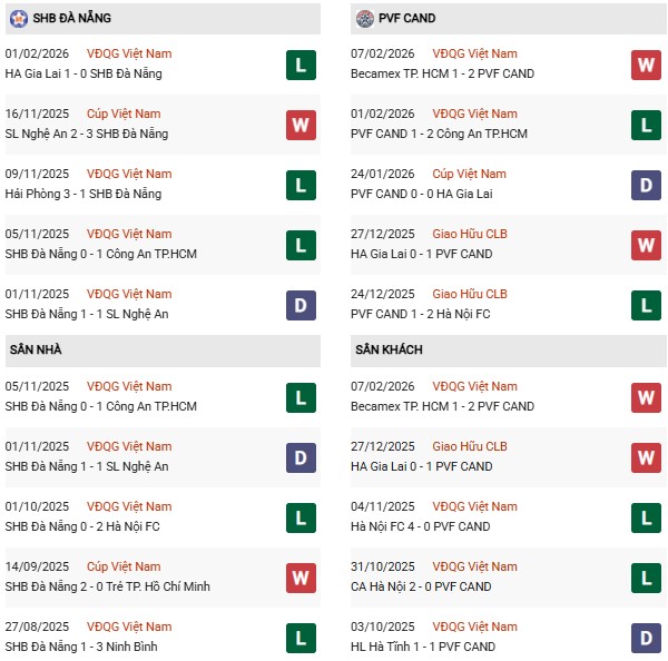 Thống kê phong độ Đà Nẵng vs PVF-CAND: