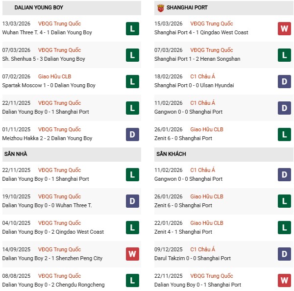 Thống kê phong độ Dalian Yingbo vs Shanghai Port: