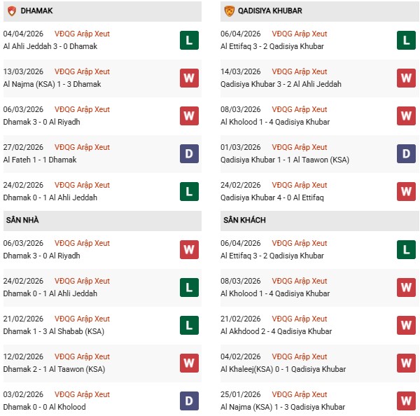 Thống kê phong độ Damac vs Al Qadisiya: