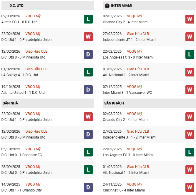 - Trên sân nhà, D.C United thắng 2, thua 2 trước Inter Miami.