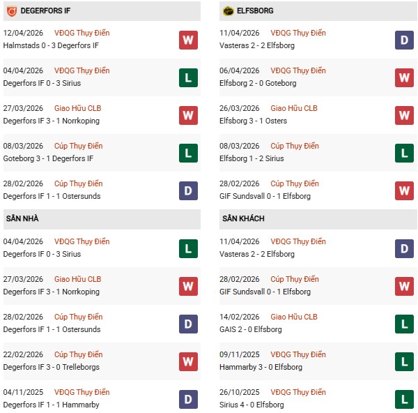 Nhìn rộng ra, trong 5 trận gần nhất trên mọi đấu trường, Degerfors thắng 2, hòa 1 và thua 2. Đáng chú ý, khả năng tận dụng lợi thế sân nhà của họ đang bị đặt dấu hỏi khi chỉ thắng 1/3 trận gần nhất tại thánh địa của mình.