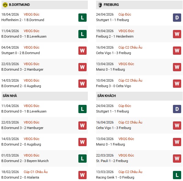 - Trên sân nhà, Dortmund thắng 9, hòa 1 trước Freiburg.