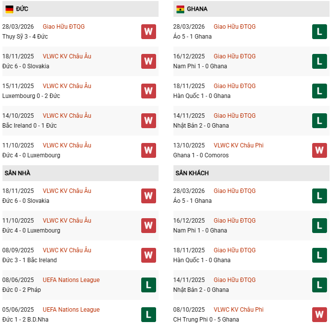 Thành tích đối đầu Đức vs Ghana: