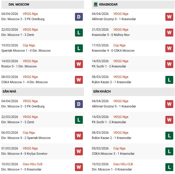 Thống kê phong độ Dynamo Moscow vs Krasnodar: