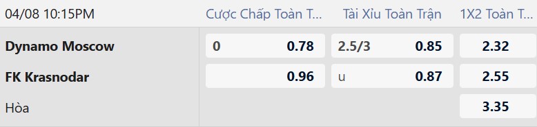 Thông tin tỷ lệ kèo Dynamo Moscow vs Krasnodar: