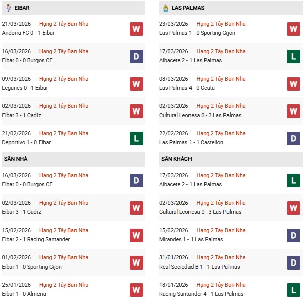 - Eibar thắng 4, hòa 2, thua 4 trong 10 trận gặp Las Palmas gần đây.