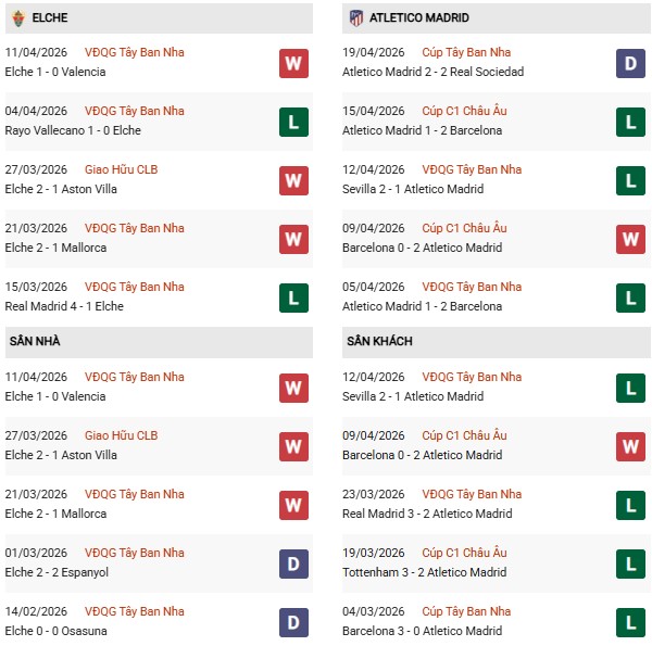 Thống kê phong độ Elche vs Atletico Madrid: