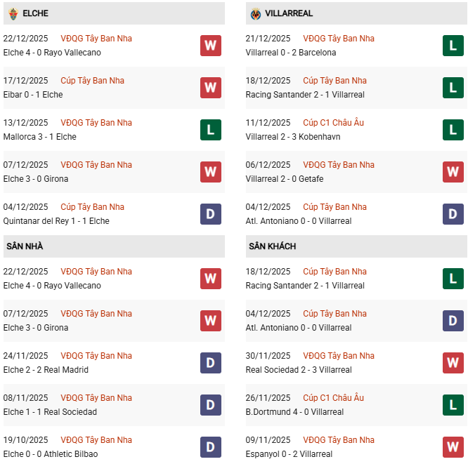 - Elche thắng 2, hòa 5, thua 3 trong 10 trận gặp Villarreal gần đây.