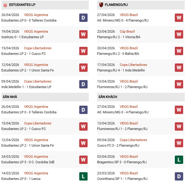 Thống kê phong độ Estudiantes vs Flamengo: