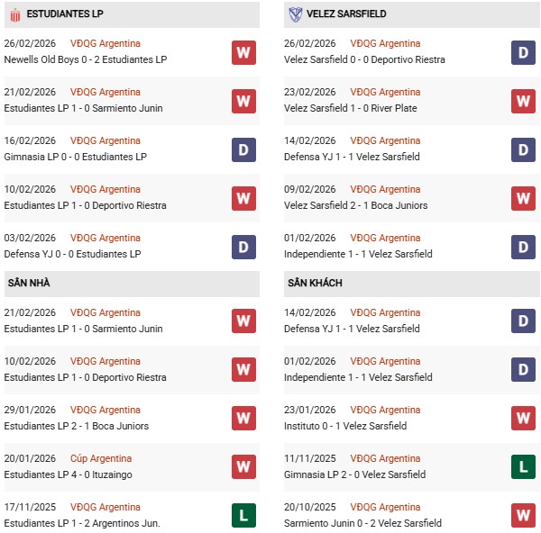 Thống kê phong độ Estudiantes vs Velez Sarsfield: