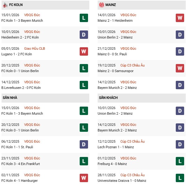 - Trên sân nhà, FC Koln thắng 3, thua 1 trước Mainz.