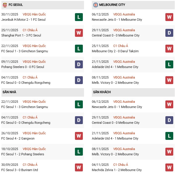 Bên kia chiến tuyến, Melbourne City lại đang nắm lợi thế nhỏ khi xếp thứ 2 với 9 điểm (thắng 3, thua 2), nhưng chỉ hơn FC Seoul đúng 1 điểm. Melbourne City đang sở hữu phong độ ấn tượng với 6 chiến thắng, 3 trận hòa và chỉ 1 trận thua trong 10 trận gần nhất. Họ cũng thể hiện sự ổn định khi thi đấu xa nhà, đạt thành tích thắng 4, hòa 3, thua 3 trong 10 chuyến hành quân vừa qua. Sự hiệu quả trong lối chơi phản công nhanh và thể lực sung mãn tiếp tục là điểm mạnh của đại diện Australia.