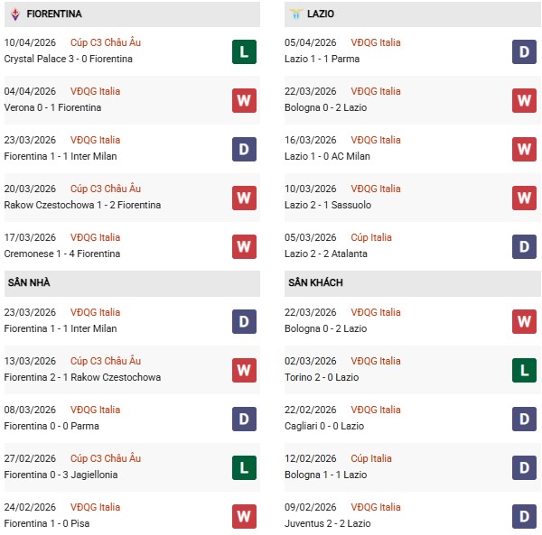 - Trên sân nhà, Fiorentina thắng 4, thua 5 trước Lazio.