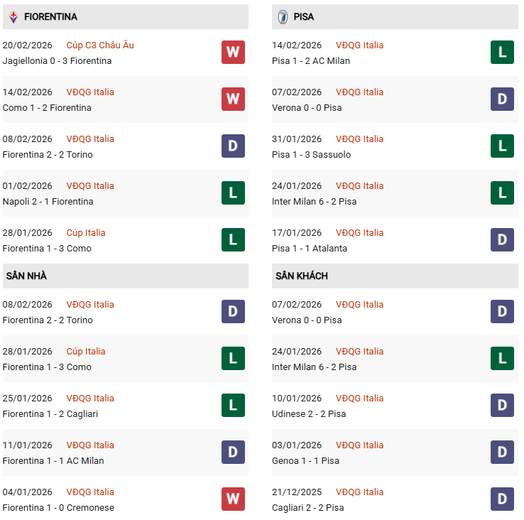 Cuộc đối đầu giữa ACF Fiorentina và Pisa S.C. tại vòng 26 Serie A là trận đấu có ý nghĩa quan trọng với cả hai đội ở nhóm cuối bảng. Fiorentina hiện đứng thứ 18 với 21 điểm, trong khi Pisa xếp áp chót (19) với chỉ 15 điểm sau 25 vòng. Đây được xem là cơ hội không thể tốt hơn để đội chủ sân Artemio Franchi giành trọn 3 điểm và cải thiện vị trí.