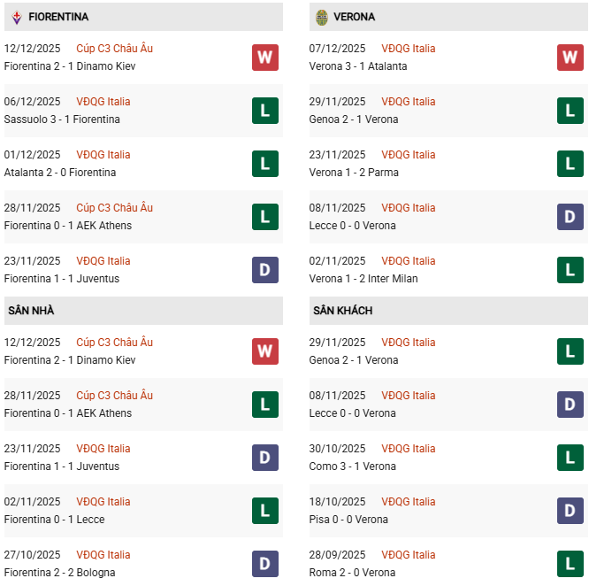 Bên kia chiến tuyến, Verona cũng đang trải qua một mùa giải khó khăn khi xếp áp chót với 9 điểm, chỉ hơn chính Fiorentina khoảng cách 3 điểm. Sau 14 vòng đấu, Verona mới có 1 chiến thắng, 6 trận hòa và 7 thất bại, cho thấy sự thiếu ổn định kéo dài. Phong độ gần đây của đội khách cũng không mấy tích cực khi họ thắng 1, hòa 3 và thua 6 trong 10 trận vừa qua.