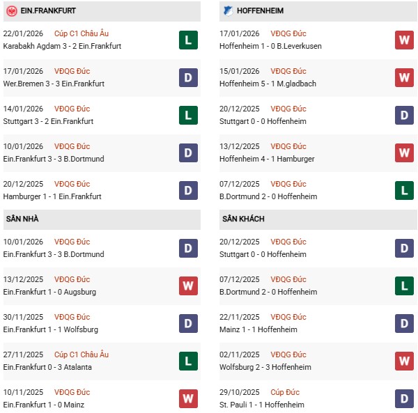 Thống kê phong độ Frankfurt vs Hoffenheim: