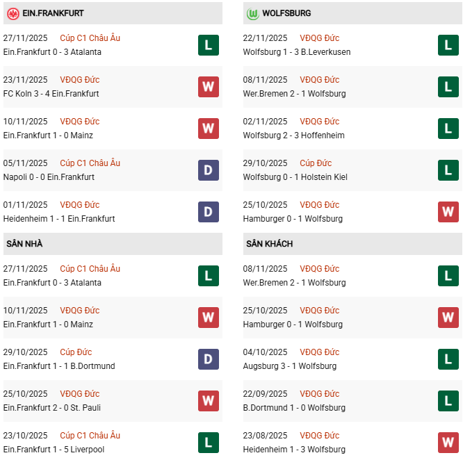 - Trên sân nhà, Frankfurt thắng 1, thua 6 trước Wolfsburg.