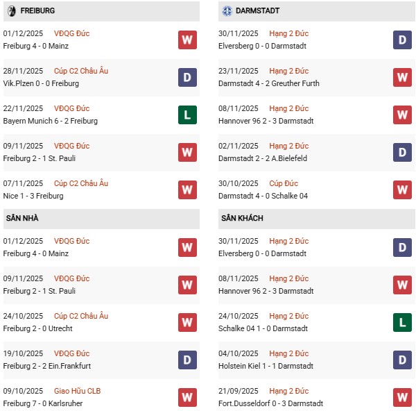 Thống kê phong độ Freiburg vs Darmstadt: