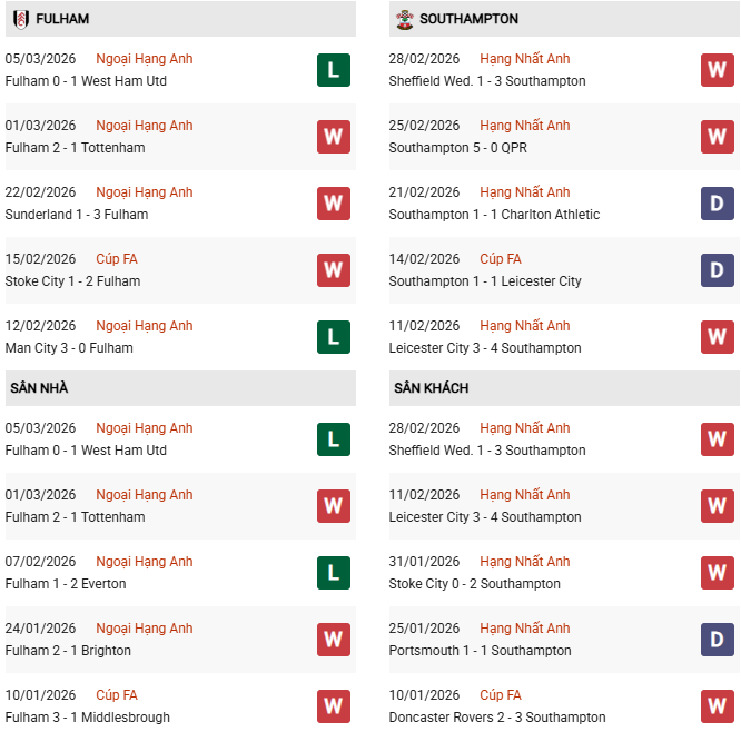 - Fulham thắng 4, hòa 2, thua 4 trong 10 trận gặp Southampton gần đây.