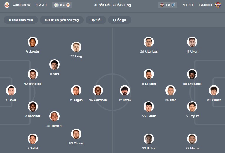 Đội hình dự kiến Galatasaray vs Eyupspor: