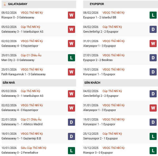 Thống kê phong độ Galatasaray vs Eyupspor: