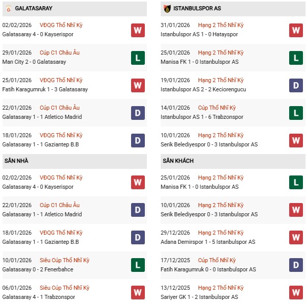 - Trên sân nhà, Galatasaray thắng 5, hòa 2 trước Istanbulspor.