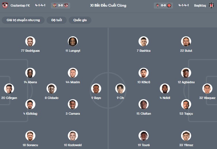 Đội hình dự kiến Gaziantep vs Besiktas: