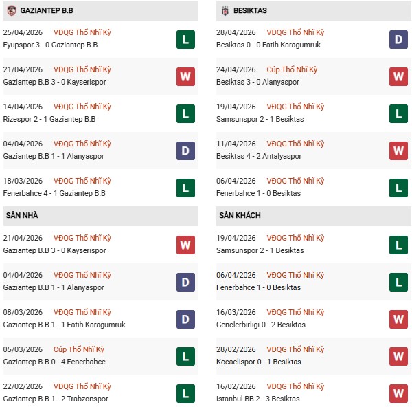 - Trên sân nhà, Gaziantep thắng 4, thua 1 trước Besiktas.