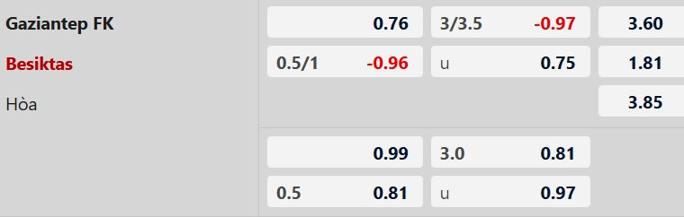 Thông tin tỷ lệ Gaziantep vs Besiktas: