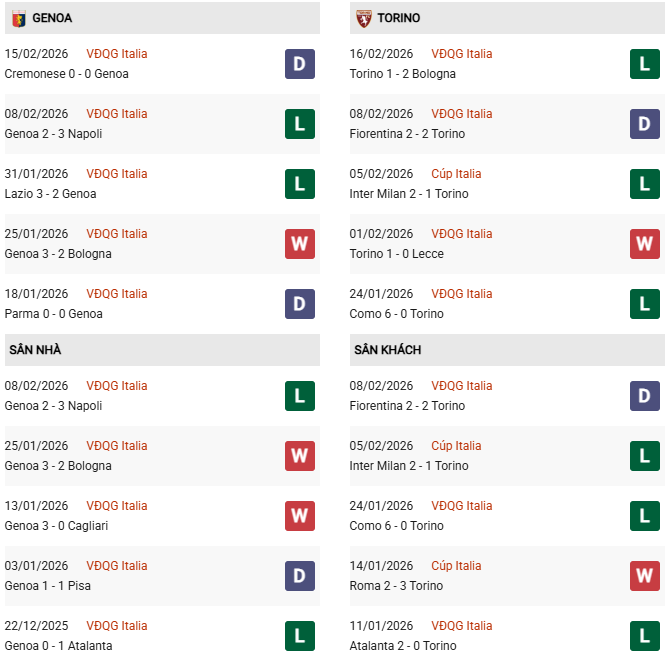 Thống kê phong độ Genoa vs Torino: