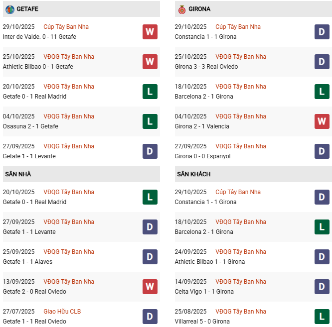 Lịch sử đối đầu cho thấy Getafe có phần nhỉnh hơn khi thắng 5 trong 14 lần gặp Girona, bao gồm chiến thắng 2-1 hồi tháng 2/2025. Dẫu vậy, họ từng để thua 0-1 trước đối thủ này trong trận đấu trên sân nhà mùa trước, nên đoàn quân của Bordalas chắc chắn rất khao khát phục thù khi tái ngộ tới đây.