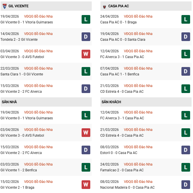 - Gil Vicente thắng 1 thua 1 và hòa 3 trong 5 lần gần nhất gặp Casa Pia AC.