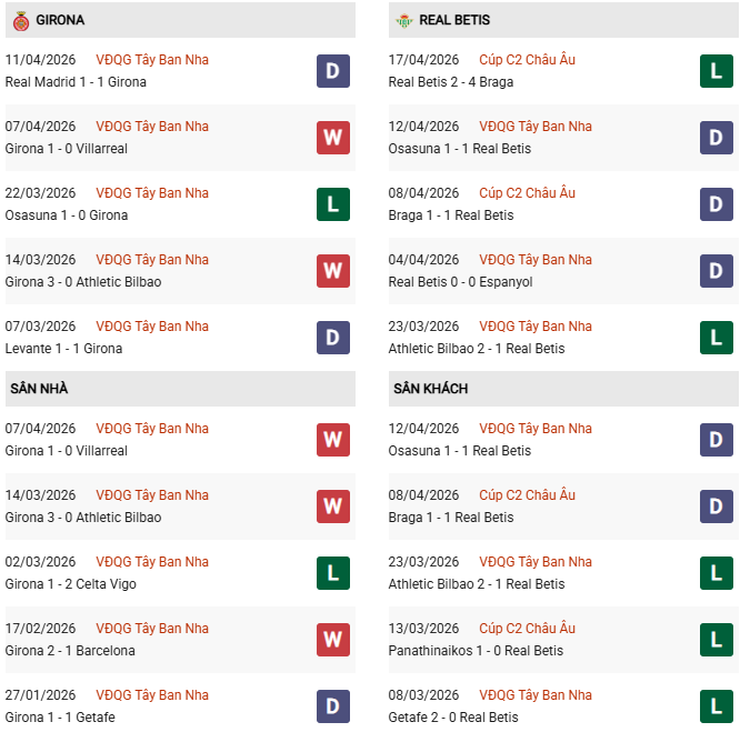 Cùng thời gian, Betis chỉ thắng 1/10 trận gần nhất. Trên sân nhà, Girona thắng 5, hòa 3 và thua 2 trong 10 trận gần nhất.