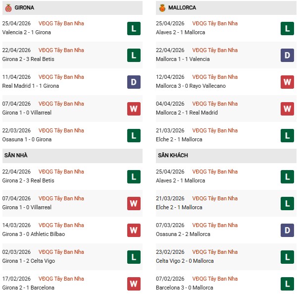 Thống kê phong độ Girona vs Mallorca: